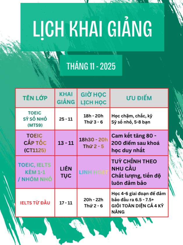 - Thời gian học & Lịch khai giảng: vui lòng xem mục LỊCH KHAI GIẢNG theo từng tháng.